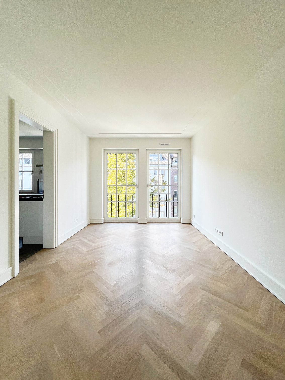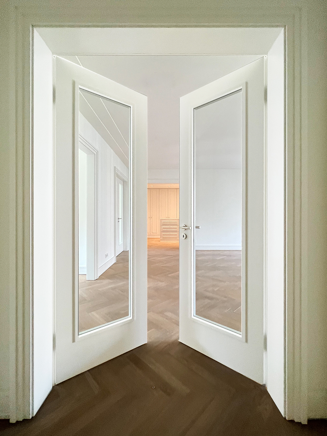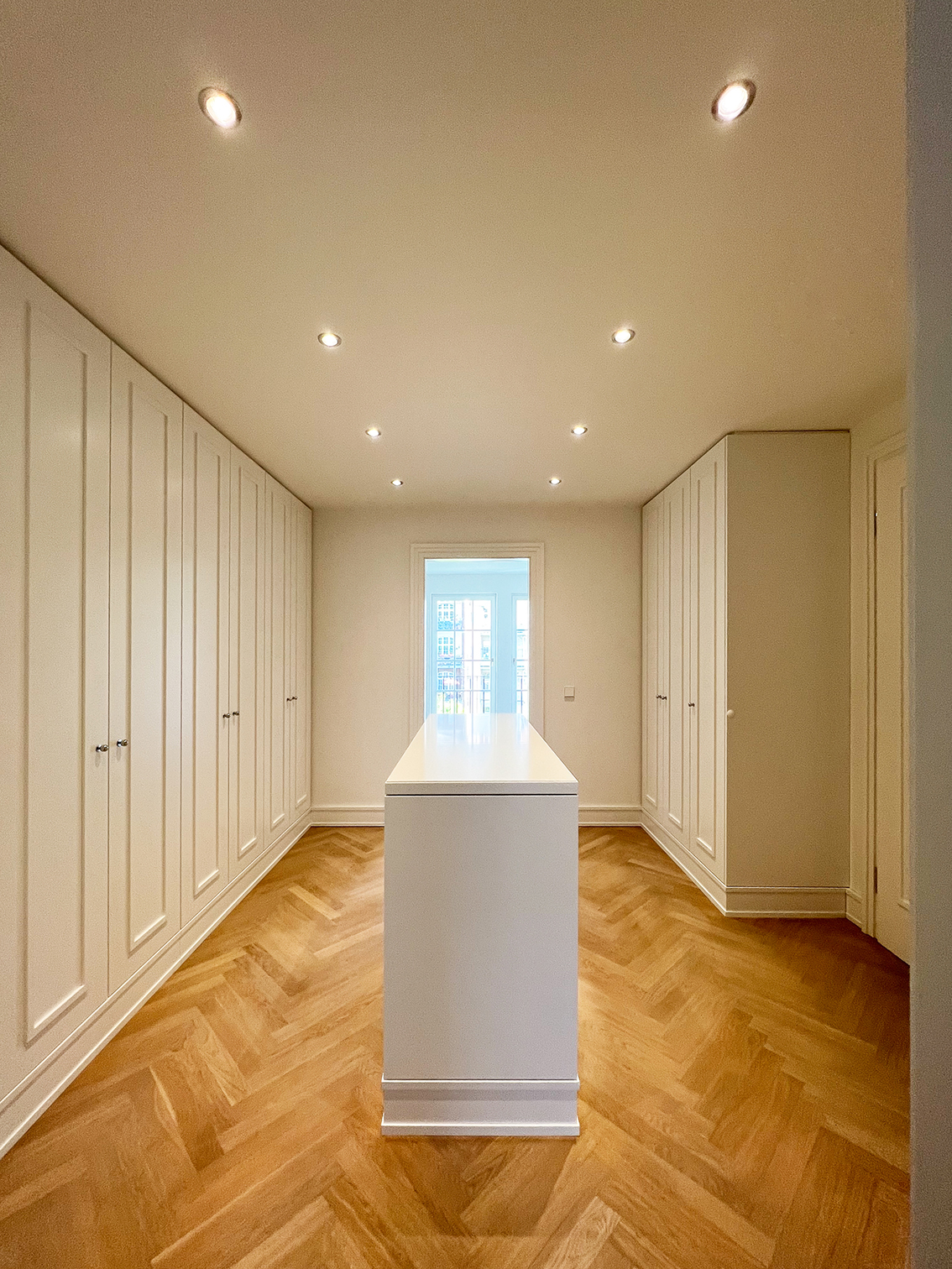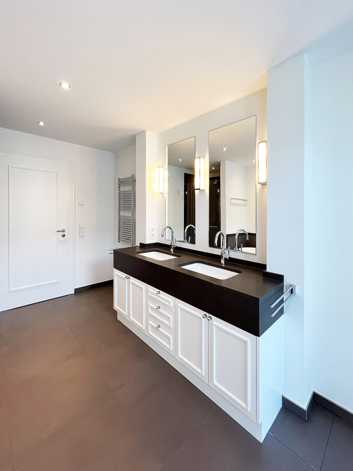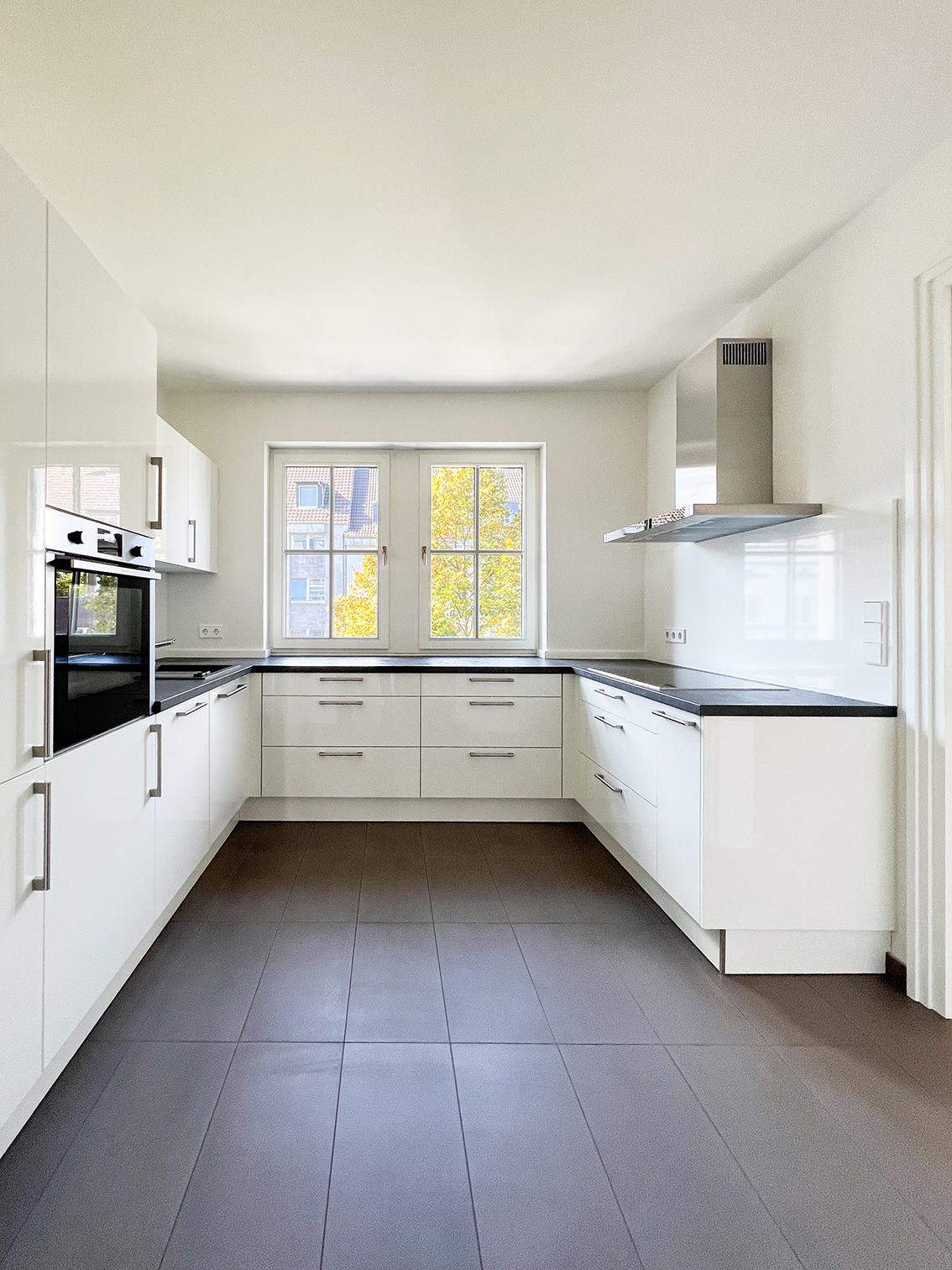 Sie erreichen das 3.Obergeschoss selbstverständlich mit dem Aufzug, dieser bringt Sie von der Tiefgarage in das entsprechende Geschoss. Die ca. 157,4 m² verteilen sich gekonnt auf einer Ebene und bieten Raum, Großzügigkeit, Licht sowie Komfort für ein Paar oder eine Familie mit bis zu einem Kind. Alle Wohnräume verfügen über Eichenparkettböden in neuwertigem Zustand. Eine stattliche Raumhöhe ist in der gesamten Einheit gegeben. Alle Wände sind glatt verputzt, dies gilt ebenso für die Decken, welche teilweise über Deckenprofile verfügen. Die Fußleisten sind ausnahmslos hoch, die weiss lackierten Türen, teilweise Flügeltüren, einige mit Glaseinsätzen, wurden ebenso mit Profilen und vernickelten Beschlägen ausgestattet. Die Hochwertigkeit der gesamten Immobilie spiegelt sich natürlich auch in den einheitlichen Bädern wider. Diese präsentieren sich in dunklem, großformatigen sowie edlem Feinsteinzeug. Ausgewählte Sanitärobjekte, verchromte Armaturen (Fa Dornbracht), Duschen mit Glastürelementen, große Spiegel, ideale Proportionen uvm. runden an dieser Stelle perfekt ab. Die Wohnung ist mit einer kompletten Einbauküche ausgestattet, diese verfügt über sämtliche Marken-Elektrogeräte und ist bereits Bestandteil der Mietsache. Die sehr passende und halb geöffnete Küche bietet Ihnen sowohl die Möglichkeit des kommunikativen Kochens, also auch die Separation durch entsprechende Türelemente. Weitere hochwertige, passende und praktische Einbauten befinden sich an diversen Stellen. Der Ankleideraum ist ebenso mit einer maßgefertigten und komplett eingebauten, großen Ankleide ausgestattet – einziehen auspacken, wohlfühlen!